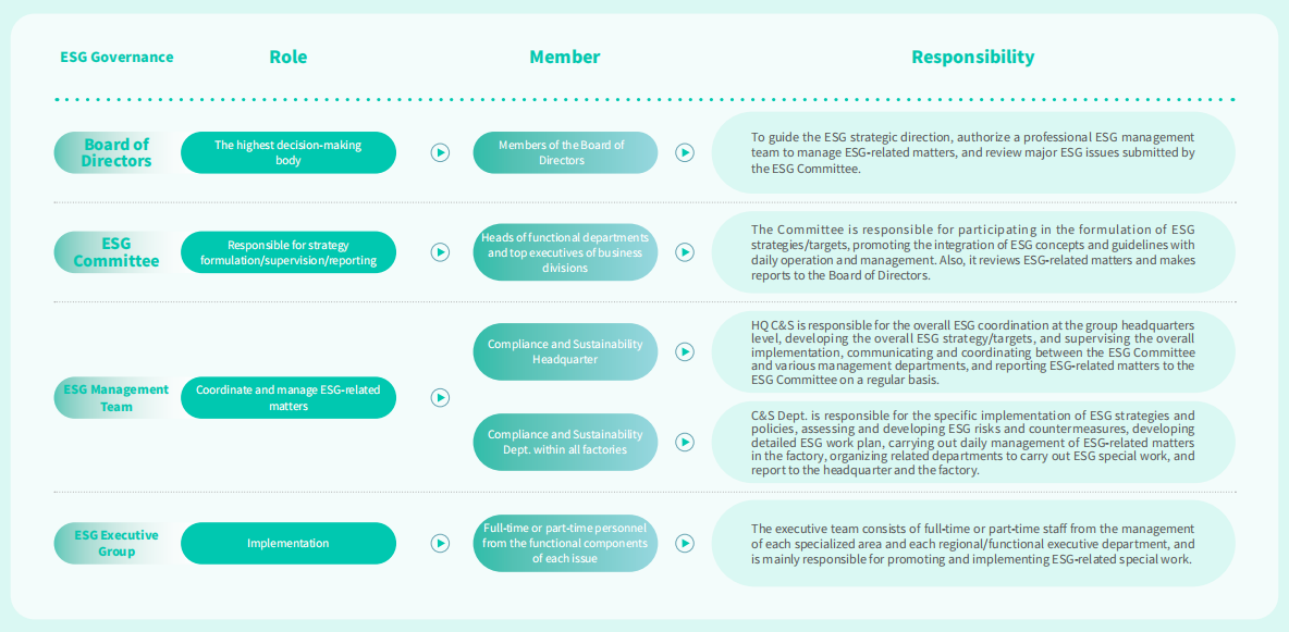 In daily management and operations, Huali Group actively adopts and integrates ESG (Environmental, Social, and Governance) principles into its operation activities, and continuously devotes itself to the improvement and optimization of its ESG management system. The group has established Compliance and Sustainability Dept. at both headquarters and each factory level to oversee ESG-related work.
