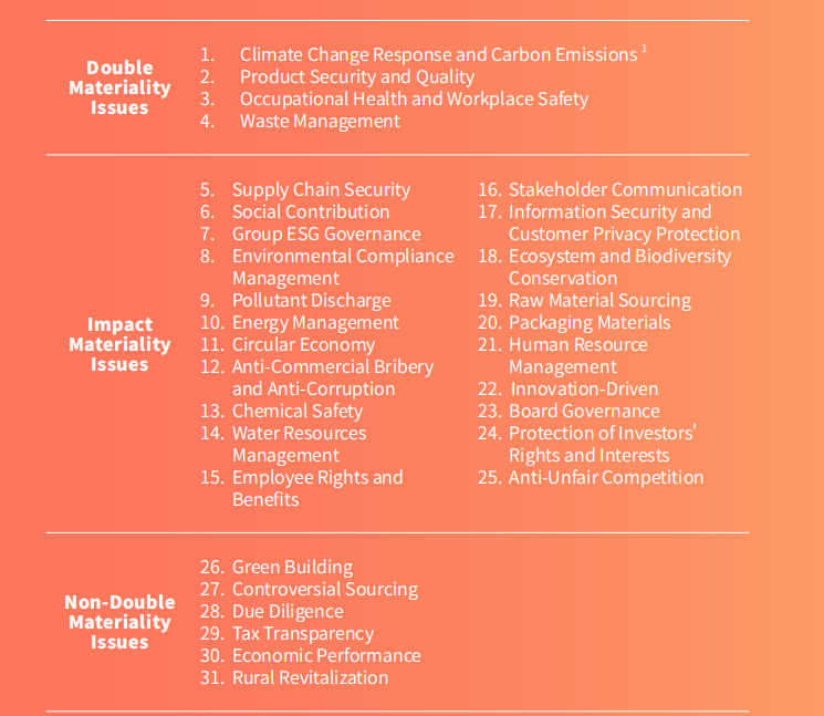 Huali Groups 2024 Material Issues List