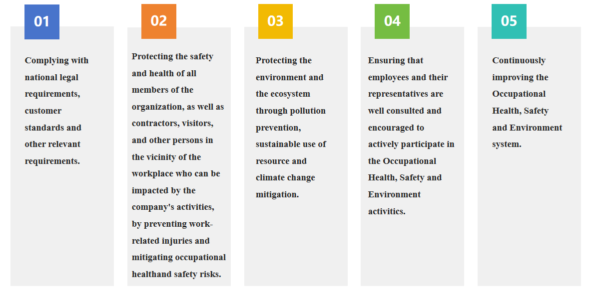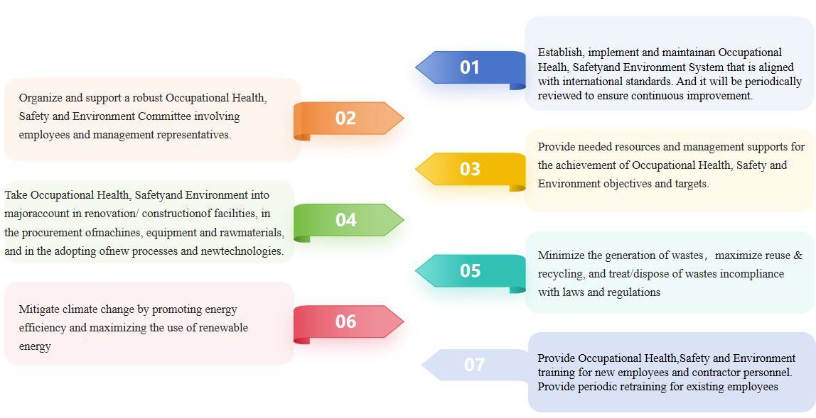 All factories of our group have set the comprehensive ESH management system based on ISO14001&ISO45001,regularly conduct environment impact assessment , HS risk assessment and conduct a comprehensive analysis of the potential impacts of production activities on the surrounding ecosystem, including wastewater discharge, energy consumption, waste disposal, and noise control, while identifying potential hazard source in production processes, workplace, and equipment facilities, upholding continuous improvement principle to reduce the risk on environment, health and safety to an acceptable level.