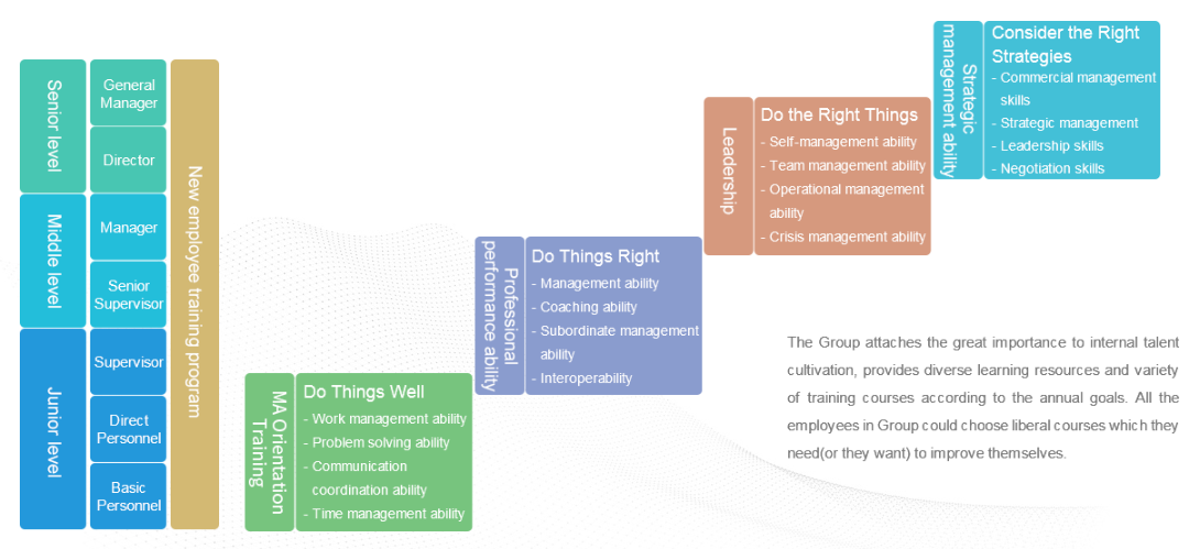Professional talent is an important asset to the Group. Only by continuously enhancing the overall capabilities of the group can we create advantages for the group to continuously advance to the top; we provide a complete training system and development planning to improve professional management abilities and encourage employees to engage in self-development. Through the regular updating of the management training blueprint, the staff can follow the map, understand the professional knowledge required at each stage of the position, and work in four main directions: