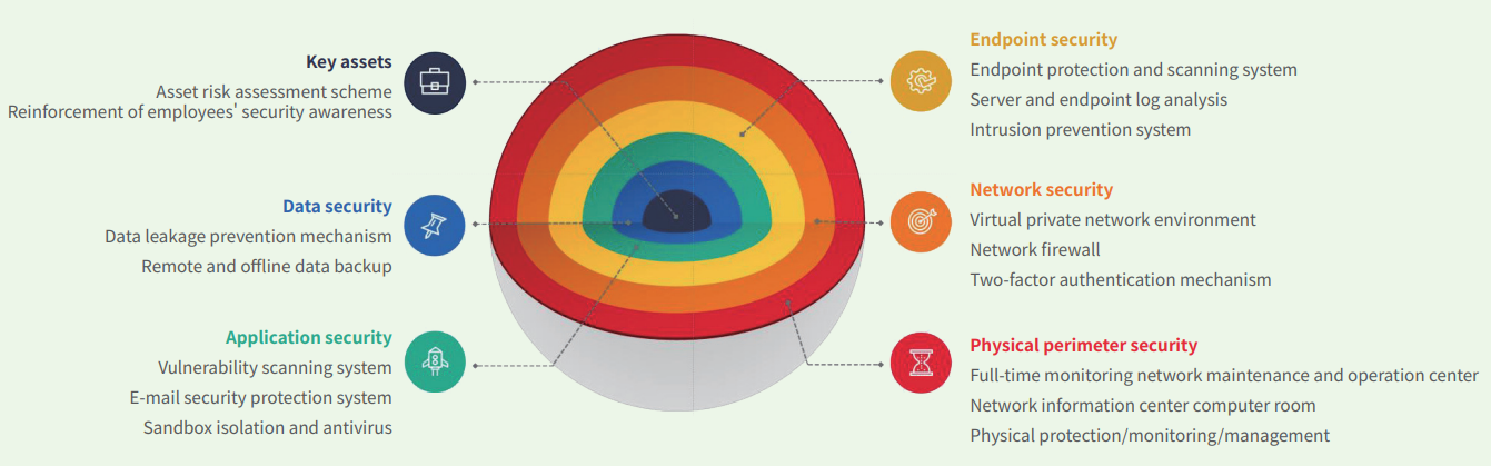 We establish a multi-layered defense mechanism spanning assets, data, systems, networks, and the surrounding environment. This framework is supported by an information security incident reporting and response platform, alongside comprehensive information security management policies.