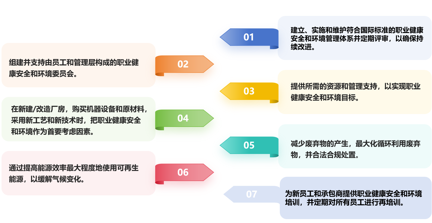 集团旗下的工厂均依据 ISO14001与 ISO45001 标准建立了完善的 ESH 管理体系。工厂会定期开展环境影响评价与健康安全风险评价工作,全面分析生产活动对周边生态的潜在影响,包括废水排放、能源消耗、废弃物处理及噪音控制等方面,同时排查生产流程、作业环境及设备设施等可能存在的风险源,秉承持续改善的理念,将 ESH 风险降低至可接受水平。