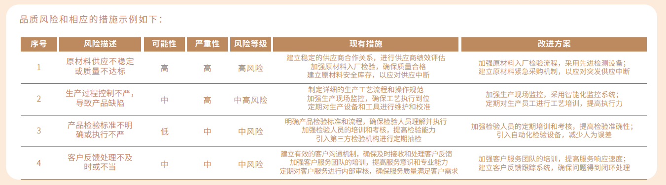 在品质方面的风险评估管理上,我们不仅关注风险,还积极识别机遇。通过深入分析市场需求、技术进步以及竞争对手的动态,我们能够发现潜在 的市场机遇和威胁所在。在此基础上,我们制定了一系列策略,旨在精准把握机遇,有效应对威胁,从而不断提升产品和服务的质量,确保满足并 超越客户的期望。