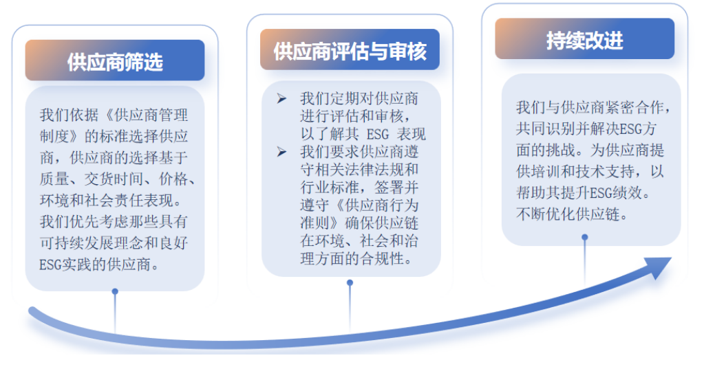 遵循可持续发展,合规性,透明公开,合作共赢原则.我们建立了全面的供应链 ESG 风险评估体系,制定目标,通过定期审查和监测供应商的 ESG 表现,及时发现潜在风险,并采取相应措施进行预防和纠正。定期对供应商进行ESG相关培训,赋能供应商提升其ESG绩效。
